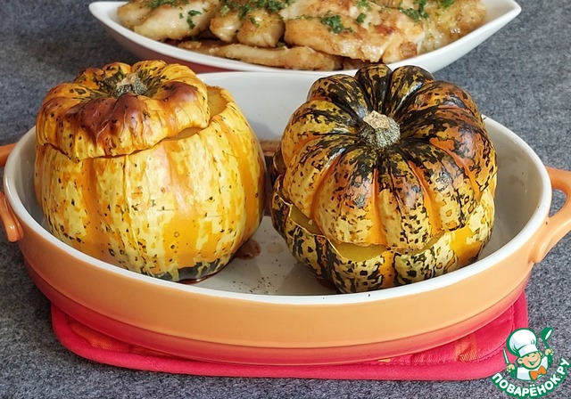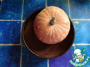 Накрываем тыквенной "крышкой". Ставим в духовку при т-180 С на 1 час 30 минут. Через 20 минут убавляем температуру до и-150-160 С. Когда верх тыквы начнёт темнеть, прикройте её фольгой. Тыкву на готовность проверяем остриём ножа. Если нож легко входит в кожицу тыквы, то можно вынимать её из духовки. Ориентируйтесь по своей духовке, возможно вам время понадобится больше.