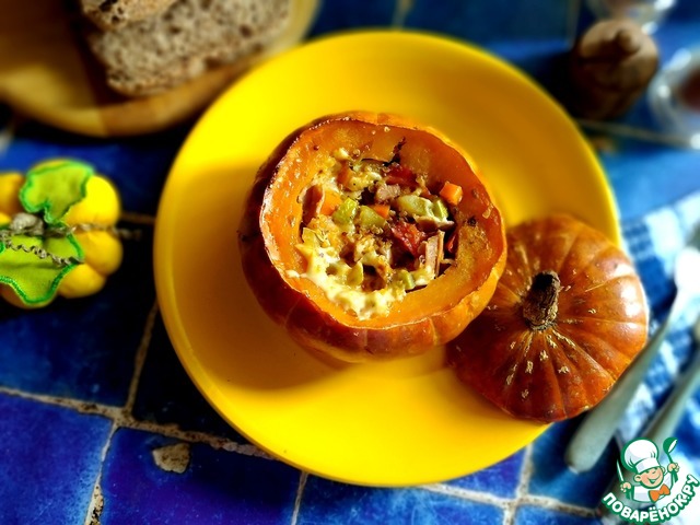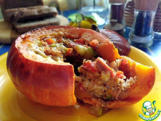 Тыква фаршированная овощами и киноа с беконом и Сулугуни. Заполните тыквенный горшочек начинкой и вы получите необыкновенное красивое горячее блюдо, которое можно приготовить и на праздничный стол.