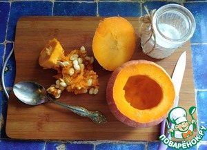 Так как тыква у меня небольшая, для рецепта все продукты взвесила. Тыква у меня в необработанном виде 600 г. Срезаем у тыквы "крышечку" и ложкой выгребаем внутри семечки и перепонки, оставляя мякоть на стенках. Внутри стенки присолим немного, втирая пальцами соль.