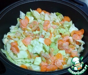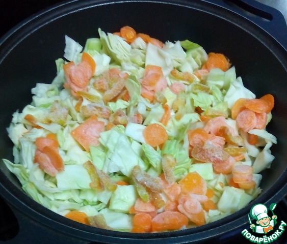 Овощи промыть, очистить. Капусту нарезать крупно, перец - небольшой соломкой, морковь - кружочками. Я использовала замороженные заготовки и перца, и моркови, что видно на фото. Очень спелый помидор натереть на крупной тёрке, кожуру удалить. Все ингредиенты отправить к шкваркам. Тушить на медленном огне под крышкой в течение 15-20 минут, периодически помешивая лопаткой.