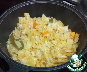 Минут за пять до окончания тушения добавить 2 листочка лавра, несколько горошин чёрного перца для аромата, 2-3 измельченных зубчика чеснока.