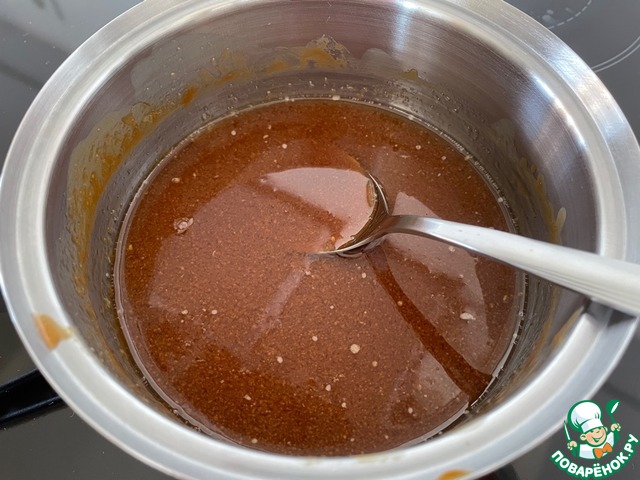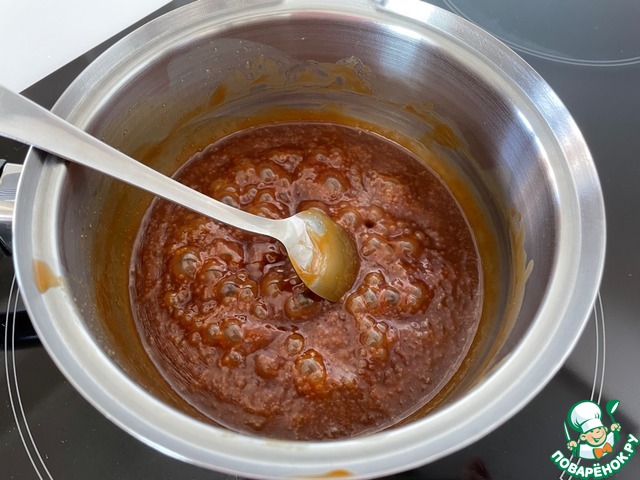 Как только сахар растворился и приобрел коричневый цвет, добавляем сливки. Сахар может карамелизоваться, тогда прогреем его со сливками до полного растворения карамели.