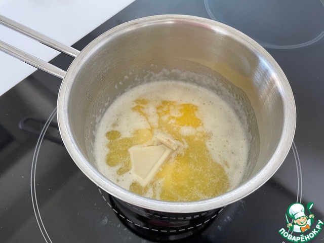 Растапливаем сливочное масло и добавляем в него белый шоколад. Все перемешать, чтобы шоколад растворился.