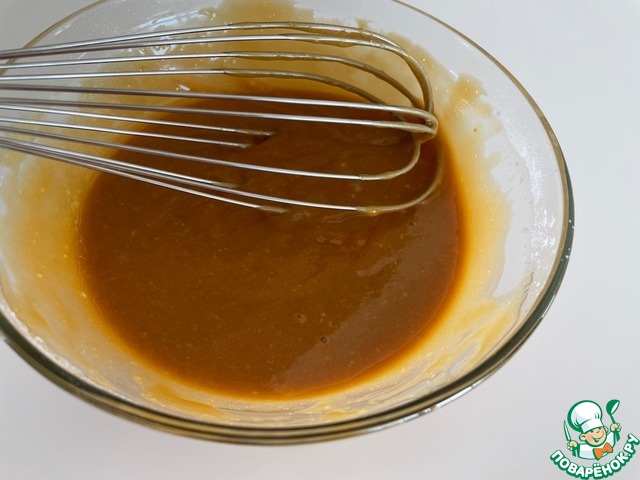 Замешиваем тесто для десерта. В нашу карамельно-масляную смесь добавляем целое яйцо и один желток (яйца мелкого размера), муку и крахмал. Хорошо вымешиваем венчиком.