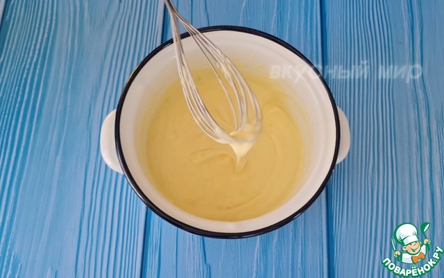 • Приготовить заварной крем. В кастрюльку влить молоко, добавляем желтки, сахар, кукурузный крахмал, муку и перемешиваем до однородности с помощью венчика. Затем поставить на средний нагрев и, непрерывно помешивая венчиком, заваривать смесь примерно 3-4 минуты, до загустения.