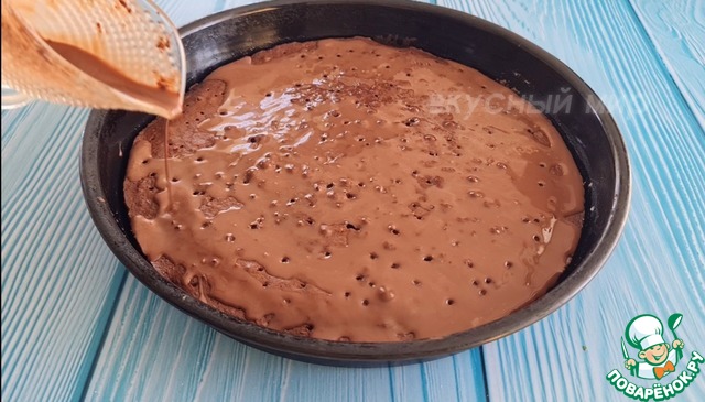 • Готовый бисквит достать из духовки, прокалывать шпажкой и полить пропиткой. Такая пропитка сделает бисквит ещё более мягким, сочным и нежным.