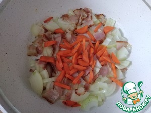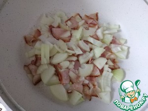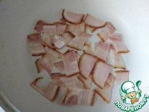 Ставим посуду на огонь. Выкладываем бекон порезанный на ломтики, чтобы вытопился из него жир. Можно взять просто свиное сало. -