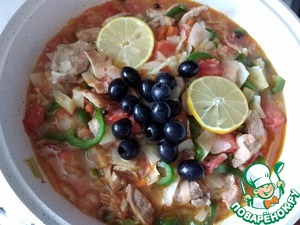 Тушим ещё 10 минут. В самом конце выкладываем маслины вместе с жидкостью, лавровый лист и дольки лимона. Доводим до кипения, тушим пару минут и выключаем огонь.