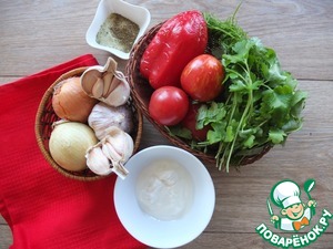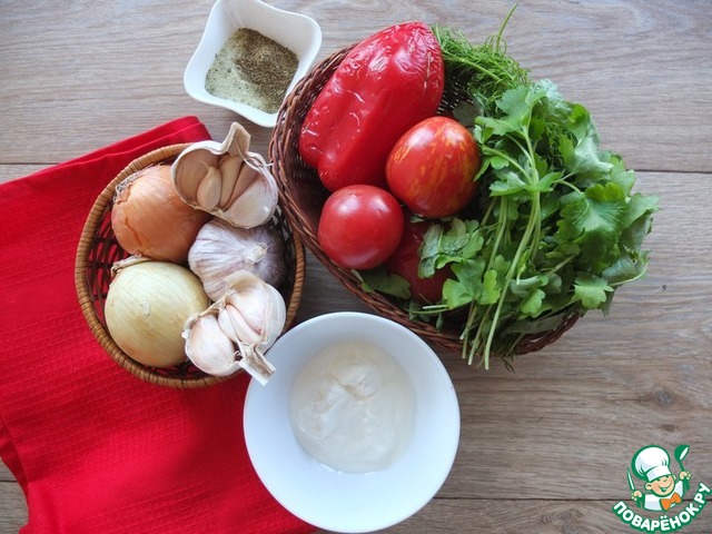 • Для овощного "слоя" нам понадобится лук, чеснок, болгарский перец, помидоры, зелень, морковь, сметана, растительное масло для жарки и специи.