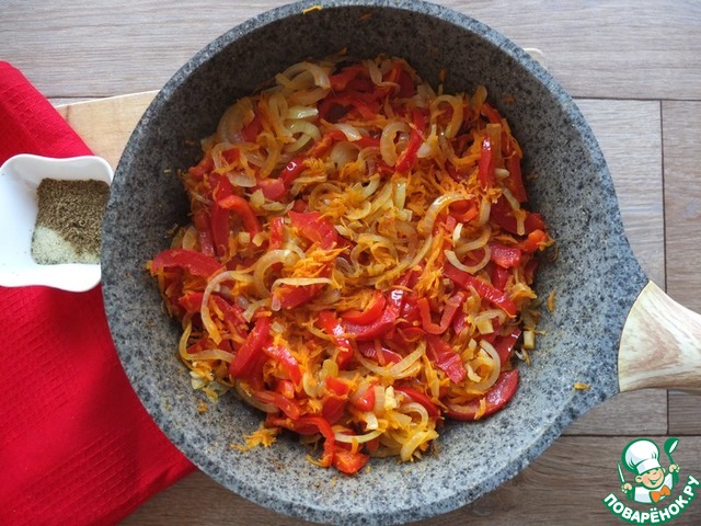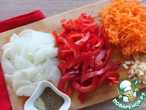 • Лук, перец и чеснок мелко нарезаем. Морковь трем на терке.