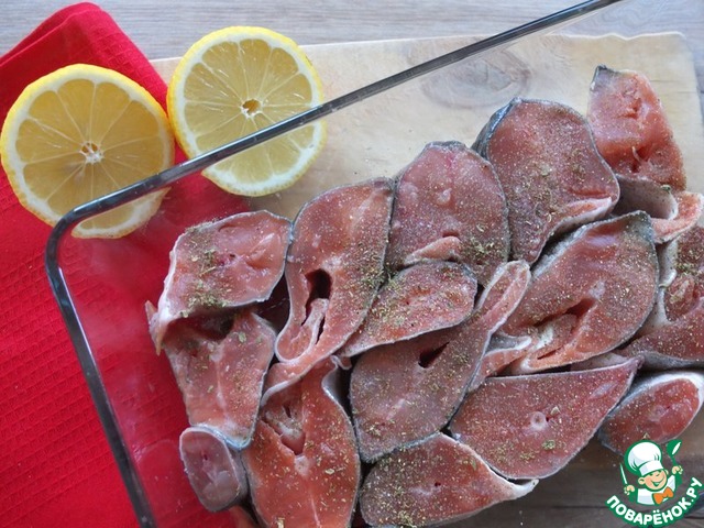 • В форму для выпечки выкладываем рыбу. У меня стейки горбуши.