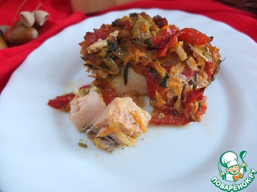 • Рыба получается сочной, ароматной, нежной, а овощной "слой" смело может выступить в качестве гарнира.