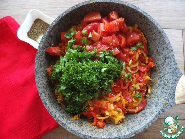 • Добавляем мелко нарезанную зелень, помидоры и тушим еще 5-7 минут.