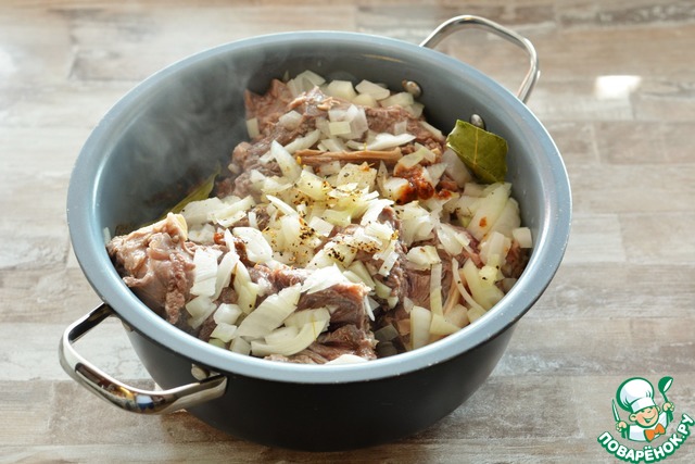 Выньте мясо из сотейника и отделите его от костей при помощи двух вилок. Разделите на небольшие кусочки и верните обратно в сотейник