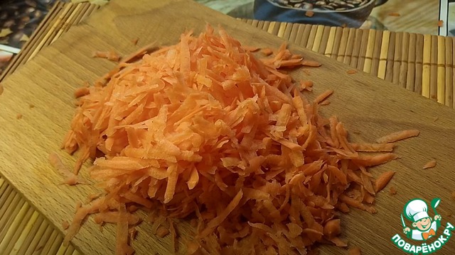 1) Морковку натираем на тёрке. ( мелкой или крупной ) ( Я переборщил с морковкой, и натёр целых две, лучше натереть 1 )
