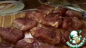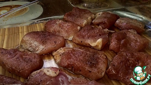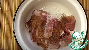 7) Далее кусочки свинины нужно посолить, поперчить и добавить приправу для мяса. Перемешиваем.