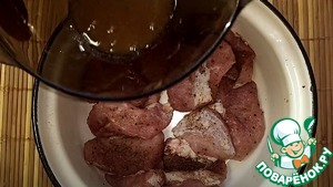 8) Затем к кусочкам свинины добавляем "маринад" и снова перемешиваем. Оставляем на минут 30.