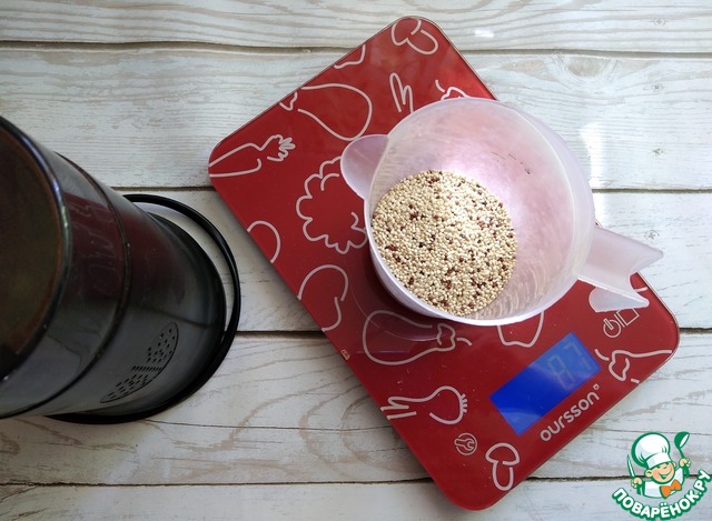 Готовим продукты для блинов. Киноа размолола в кофемолке по 35 г за один раз. Отлично перемололось. Молоко нужно подогреть. Масло сливочное растопить в СВЧ 55 секунд при мощности 800 W или на водяной бане. Молоко, масло и яйца соединяем венчиком. Добавляем сахар, соль, ванильный сахар (ванилин) и выкладываем размолотый киноа.