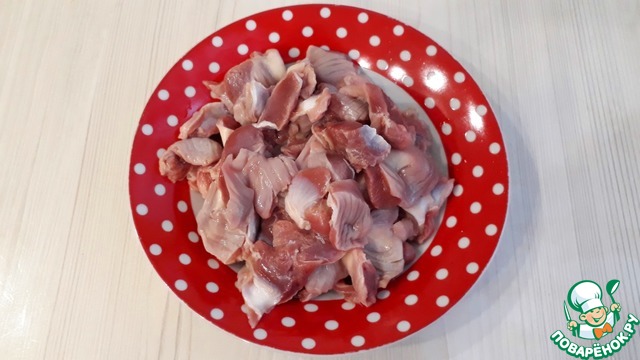 У куриных желудочков (50 гр.) удалить покровную пленку и хорошо промыть, нарезать не крупными кусочками