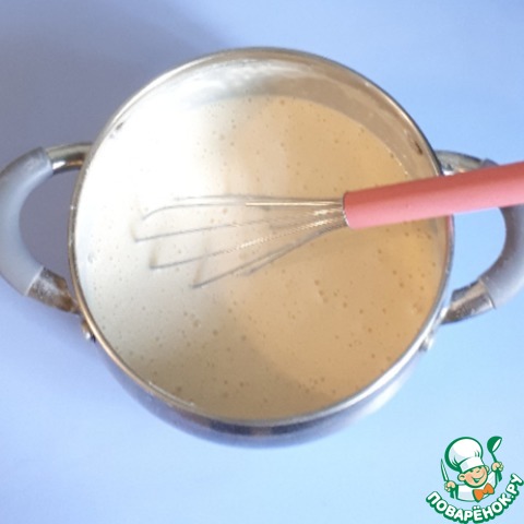 Добавить муку. Я всегда добавляю муку в жидкость и ручным венчиком тщательно размешиваю, комочков никогда не бывает. Затем влить крутой кипяток и быстро венчиком все перемешать.