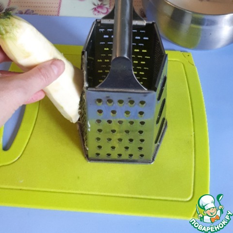 Кабачок очистить и натереть на мелкой терке, у меня было 300 гр. уже очищенного. Слегка отжать лишнюю жидкость.