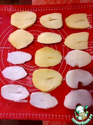 • Картофель нарезать пластинками и уложить в смазанную маслом форму. У меня силиконовый коврик, поэтому я его ничем не смазывала.