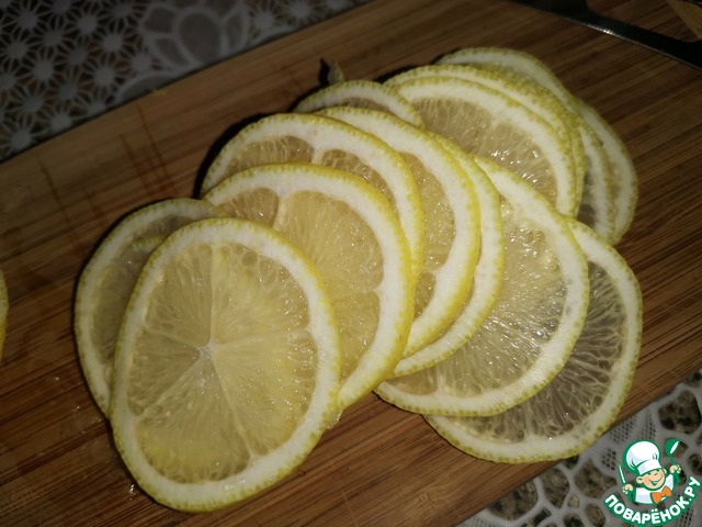 У меня был крупный лимон, поэтому одну половину я нарезала тонкими кружками, с другой половины натёрла цедру на тёрке. -