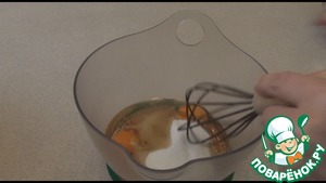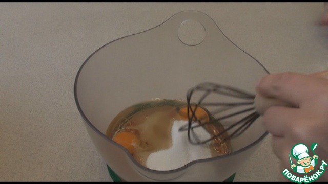 Берем 2 яйца, добавляем 100 грамм сахара и 100 мл подсолнечного масла. Размешаем все венчиком.