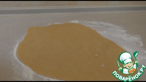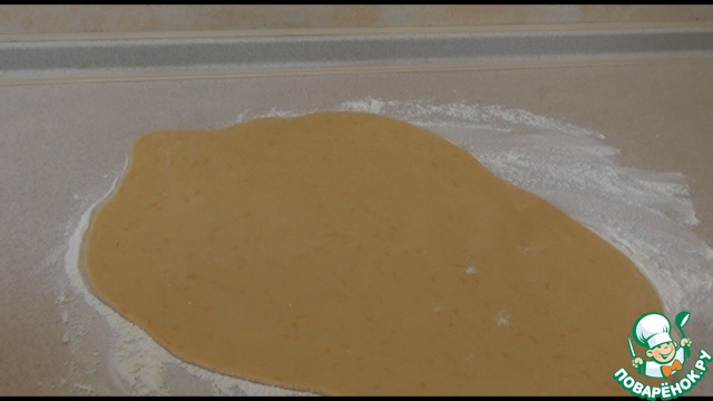 Присыпаем рабочую поверхность мукой и раскатаем тесто.