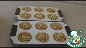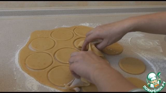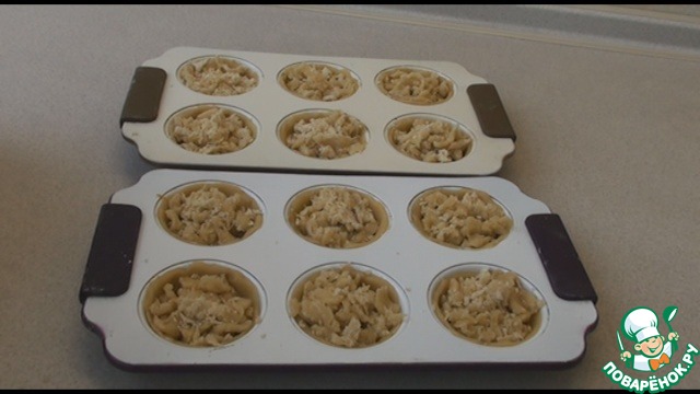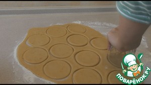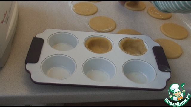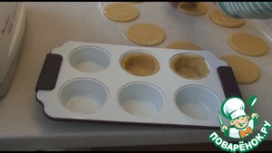 Я выпекала печенье в форме для маффинов. Поэтому нужно подобрать вырубку для печенья размером под эту форму. У меня ничего подходящего не нашлось, я взяла обычный 250 гр стакан. Делаем 12 заготовок, то есть то количество, сколько у вас формочек для маффинов.