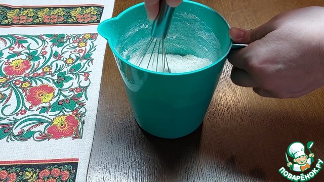 Все ингредиенты должны быть комнатной температуры. Сначала смешиваем сухие ингредиенты: 300 г муки, 2 ч. л. разрыхлителя и 1/2 ч. л. соды.