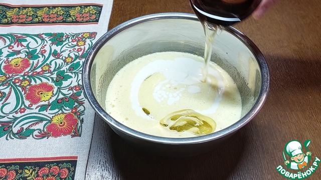 В отдельной миске хорошенько перемешиваем 2 яйца и 200 г сахара. Взбивать не нужно. В полученную массу добавляем 200 г сметаны (любой жирности, у меня 15%) и 150 мл растительного масла (у меня подсолнечное). Хорошенько перемешиваем.