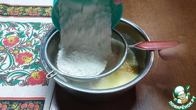 В полученную массу порционно (в 2-3 этапа) просеиваем сухие ингредиенты. Каждый раз хорошо перемешиваем, чтобы не осталось комочков муки.