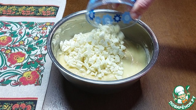 Сюда же отправляем 70 г измельчённого белого шоколада. Хорошенько всё перемешиваем, чтобы шоколад равномерно распределился по тесту.