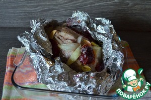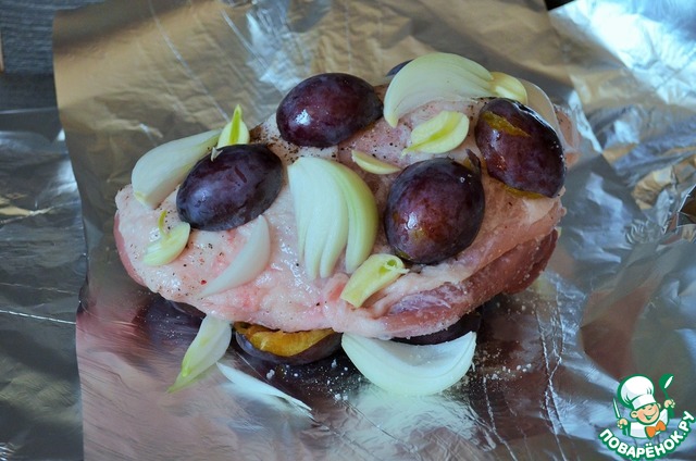 На фольгу разложить 2/3 слив, лука, чеснока.