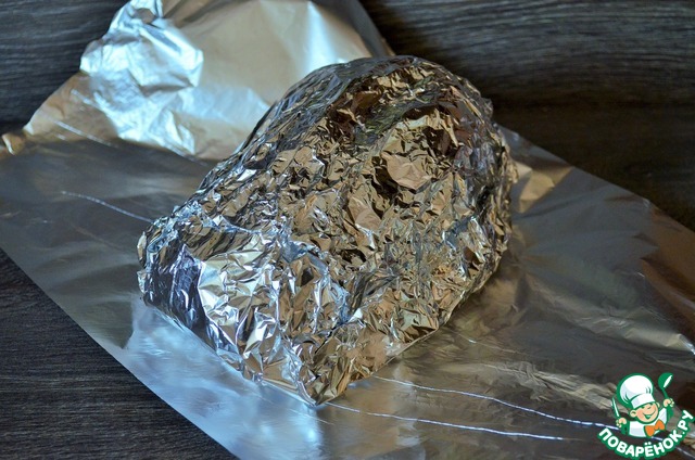 Запекать 1 час, 180-190 градусов. Затем фольгу открыть, при необходимости подсолить.