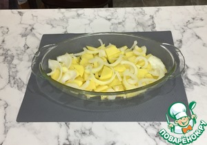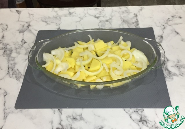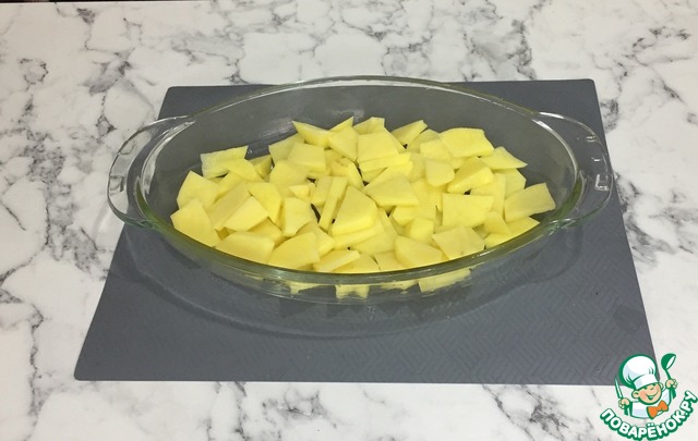 В форму для запекания наливаем немножко оливкового масла и хорошенько ее смазываем. Выкладываем картофель первым слоем.