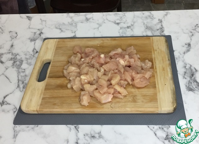 Нарезаем куриное филе мелкими кусочками и кладем поверх лука.