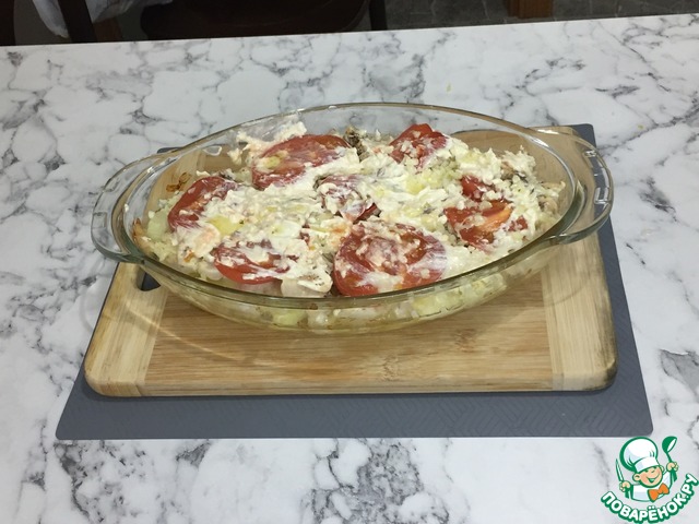 Солим, перчим по вкусу. Сверху выкладываем нарезанные кружочками помидоры. Ставим форму в разогретую духовку и выпекаем 30 минут при температуре 180 градусов.