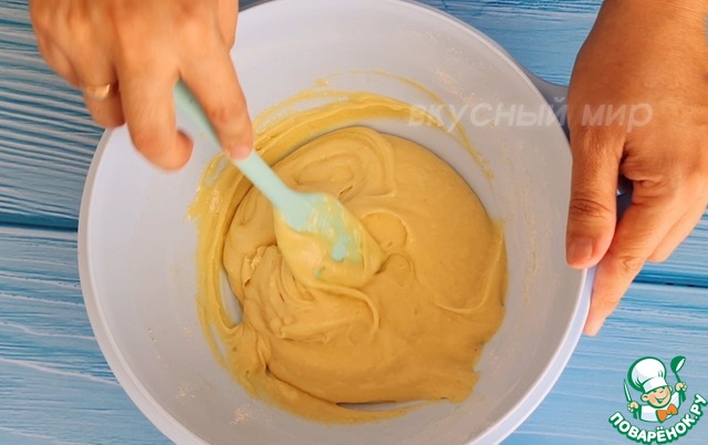 Взбить яйца с сахаром и щепоткой соли в светлую густую массу (2-3мин). Далее добавляем мягкое сливочное масло и еще раз взбиваем. Затем добавляем муку и разрыхлитель. Аккуратно перемешивать лопаткой.