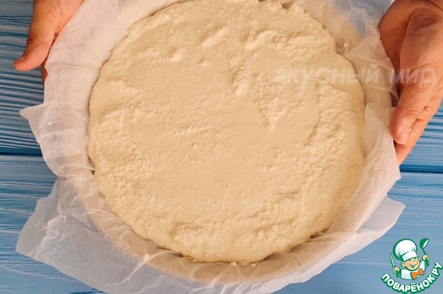 Форму (диаметр - 26 см) выстелить пергаментом или смазать сливочным маслом. Вылить тесто, разровняем.