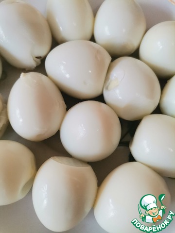 Выложим очищенные яйца целиком, примерно на одинаковом расстоянии друг от друга. Заполним пустоты между яйцами сырно - шпинатной массой.