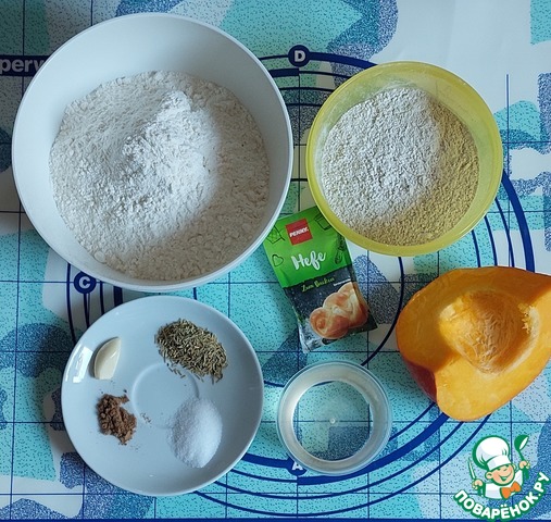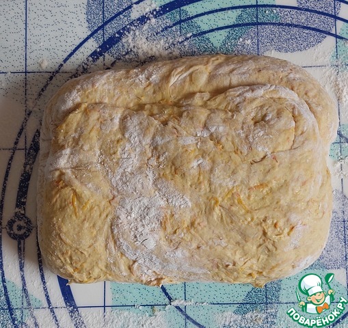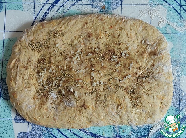 Выкладываем тесто на стол, припылённый мукой, разравниваем руками и посыпаем приправами и чесноком.