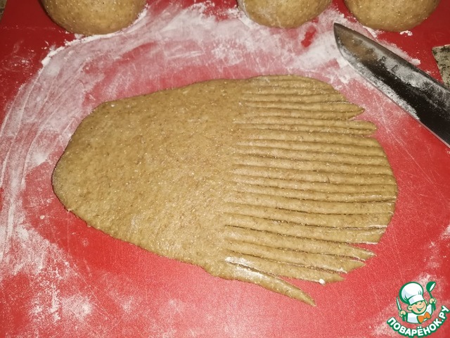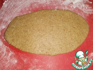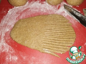 • Затем каждый колобок раскатать в виде овальной лепёшки, подпылив при необходимости, стол или доску мукой.
