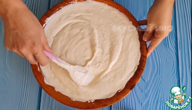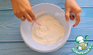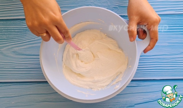 • Вводим взбитые белки в творожную массу в 3 приёма. Аккуратно перемешиваем лопатой.