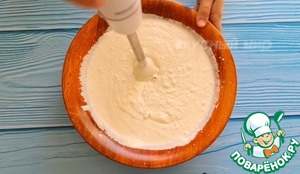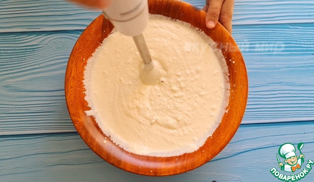 • К творогу добавляем 4 желтка, разрыхлитель, ванильный сахар и сметанно-йогуртовую массу и все пробиваем погружным блендером до гладкости.