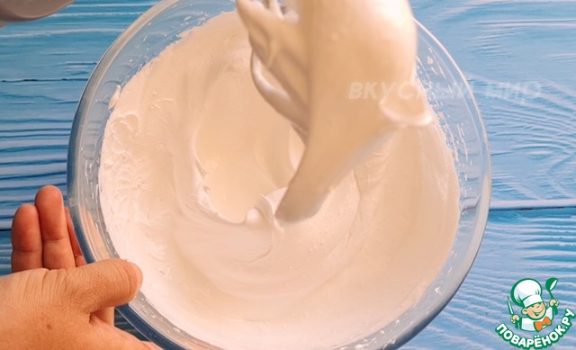 • К белкам добавляем соль, взбиваем миксером до пены, затем постепенно всыпаем сахар и взбиваем до плотных пиков.
