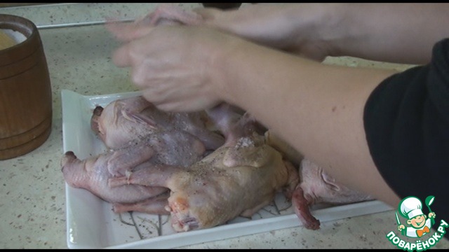 Перепела помыть и просушить. Натереть черным молотым перцем и солью. Оставить на 1 час мариноваться.