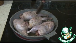 Выкладываем перепела и обжариваем до румяной корочки со всех сторон.