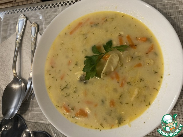 Для загустения супа смешиваю муку со сливками, вливаю смесь в суп. Солю по вкусу. Томлю суп еще минут 10-15 минут. Довожу до кипения и отключаю, накрыв крышкой. Даю блюду время настояться.